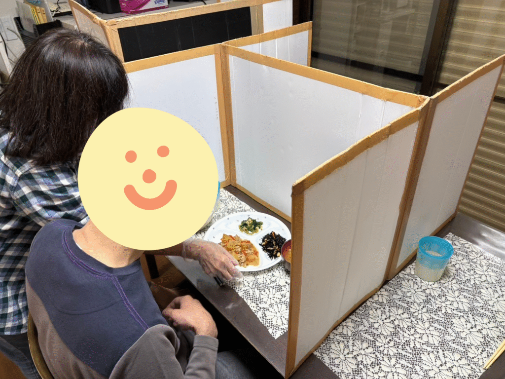 自閉傾向のある方は視覚的情報が多く入ることが苦手なので、パーテーションを立てて、一人のスペースで落ち着いて食事ができるように配慮しています。